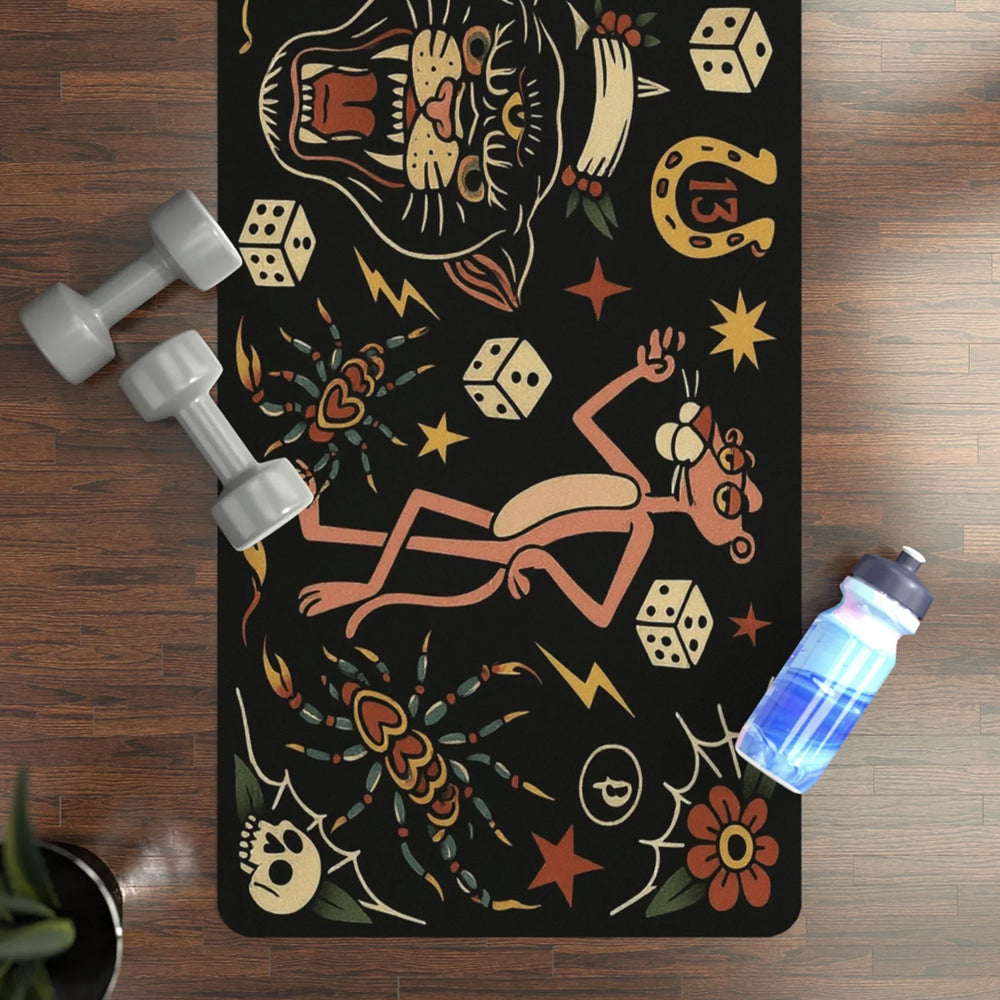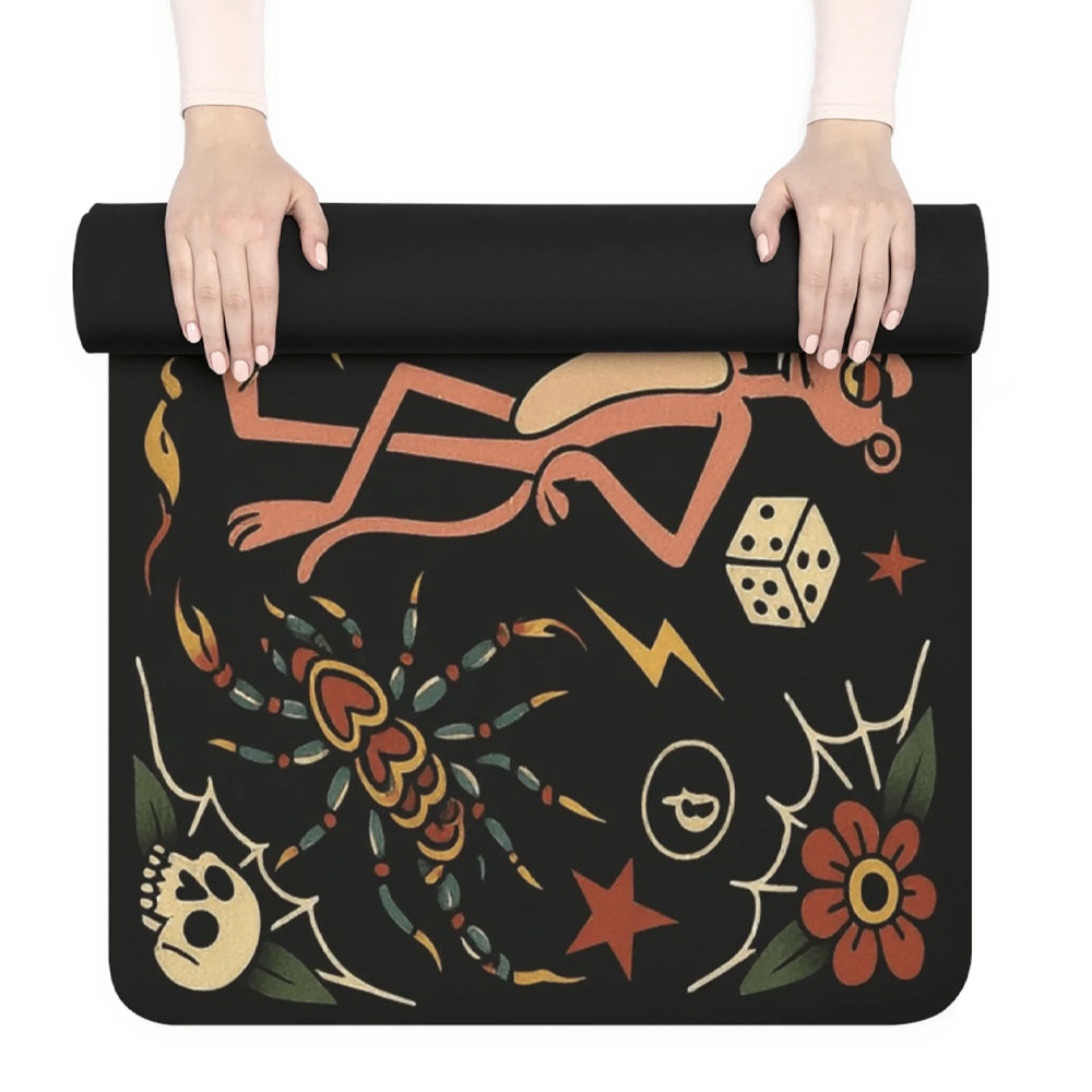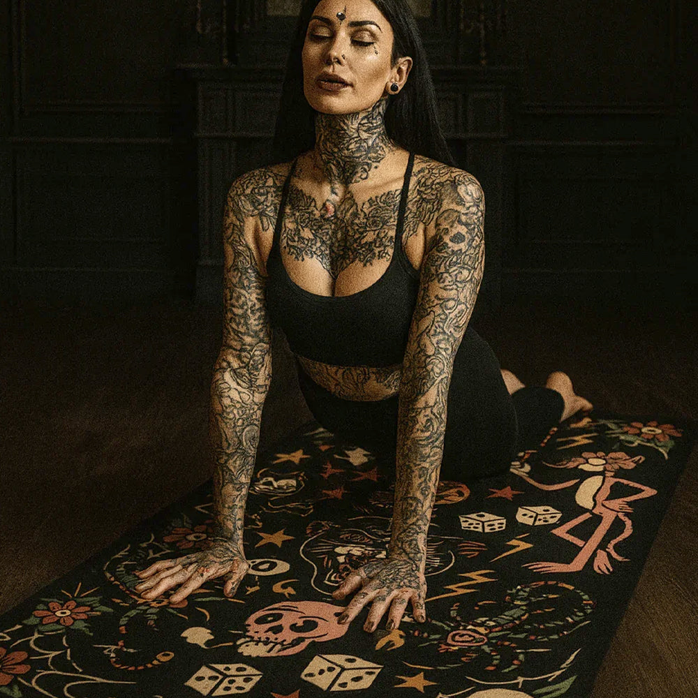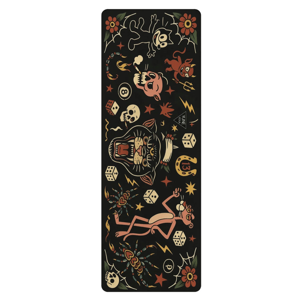 Yune Yoga Macabre & Mantras Tattoo Design Yoga Mat 3mm - Make your practice unmistakably yours with the Macabre & Mantras Tattoo Design Yoga Mat. Designed for yogis who love bold artwork without compromising performance, this lightweight 3mm mat combines a soft microfiber suede surface with a natural rubber base for dependable grip and grounded stability. Whether you're flowing at the studio, stretching at home, or heading away for the weekend, this mat delivers comfort, traction and standout style in one sleek design.